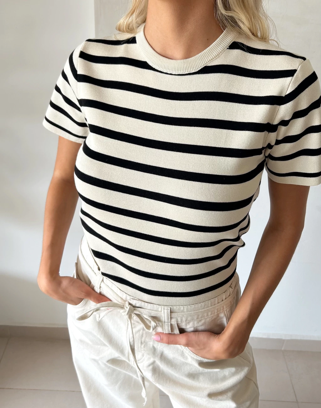 Remera mangas cortas tejida, cuello a la base. Rayas crudo y negro.